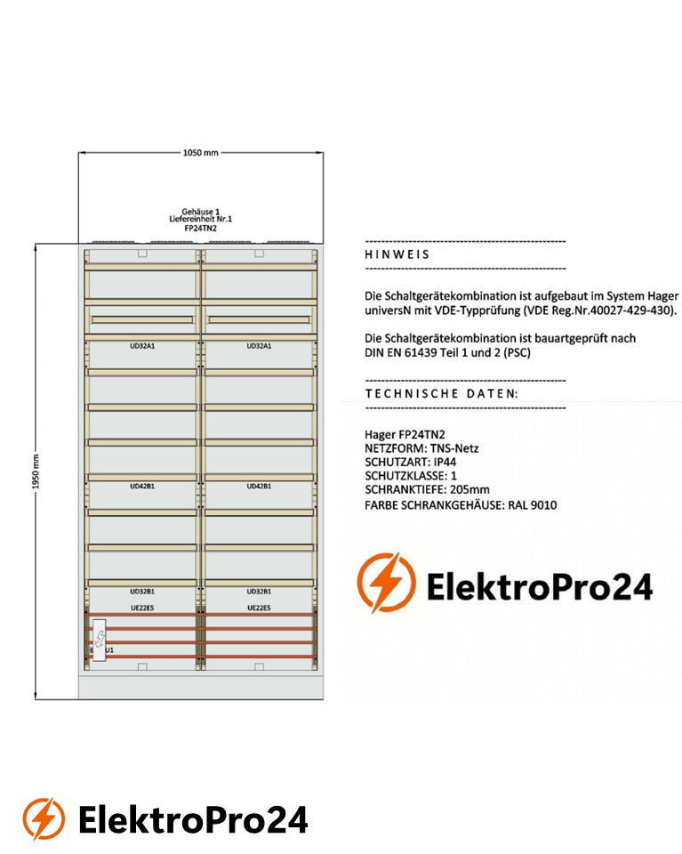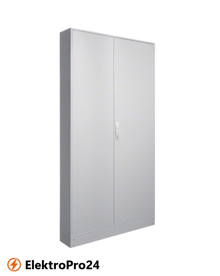 Der Hager FP24TN2 Schaltschrank ist ein Einzelstandverteiler für Innenraummontage nach DIN EN 61439 und DIN 43870. Er ist ausgelegt für Niederspannungsverteilungen bis 400 A bei 3AC 230/400 V und 50 Hz. Das robuste Gehäuse aus 1 mm pulverbeschichtetem Stahlblech mit innenliegender Kunststoffauskleidung bietet Schutzart IP44 und Schutzklasse I. Ausgestattet mit einer abfangenden waagerechten Schiene, einer Tür mit Dreipunktschließung, anflanschbaren Elementen sowie einer Sockelleiste mit abnehmbarer Front, ermöglicht der Verteiler flexible und sichere Einsätze in vielfältigen Anwendungen. Maße: 1950x1050x205 mm.