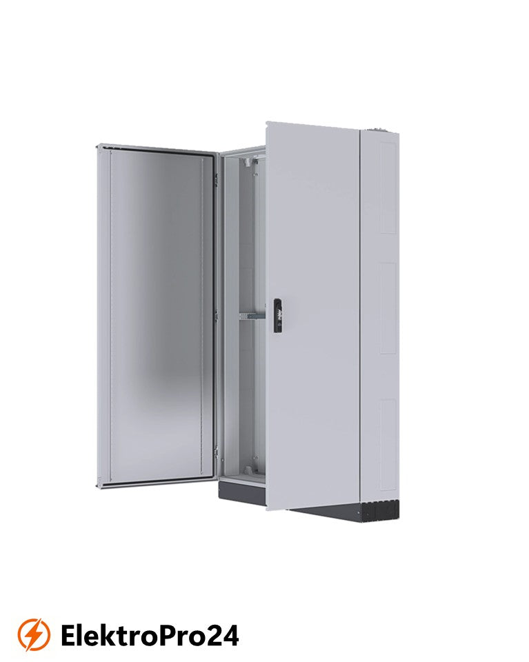Der Hager FR25E1 Schaltschrank ist ein universeller Einzelstandverteiler für die Aufputz-Montage mit den Maßen 1850x1300x275 mm plus 100 mm Sockel. Das Gehäuse aus pulverbeschichtetem Stahlblech bietet Schutzklasse I sowie Schutzart IP55 und erfüllt die Anforderungen an Luft- und Kriechstrecken gemäß DIN VDE 0110-1/-2. Ausgelegt für Niederspannungsverteilungen bis 800 A bei 3AC 230/400 V 50 Hz, ist der Schaltschrank mit vorbereiteten Sammelschienendurchführungen und einem benutzerfreundlichen Schwenkhebelverschluss ausgestattet – ideal für professionelle Elektrolösungen.