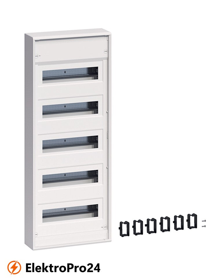 VA60CN Installationskleinverteiler Aufputz, 5x12 Platzeinheiten, IP30, aus Kunststoff, entspricht DIN VDE 60670-24 und DIN 43871. Geeignet für Wohngebäude gemäß DIN 18015, für Geräte bis 63 Ampere und 70 mm Tiefe. Bemessungsspannung 400 Volt/50 Hertz, Schutzklasse II. Ausstattung: Kunststoffbodenplatte mit Leitungsabfang, verzinkter Stahlblech-Geräteträger, DIN-Hutschiene, Kunststoffabdeckung, fingersichere Erdung+Neutralleiter-Klemme mit Stecktechnik.