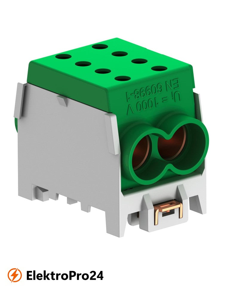 Hauptleitungsabzweigklemme, 1-polig, ermöglicht Anschlüsse von 2x70mm² bis 2x70mm² je Pol. Ideal für sichere und übersichtliche Stromverteilung in Elektroinstallationen. Leiterklemmen für die Montage auf DIN-Tragschienen, z.B. für