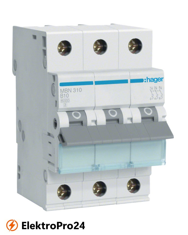 Leitungsschutzschalter Hager MBN310, Sicherungsautomat, 3-polig, 6kA, B-Charakteristik,10A